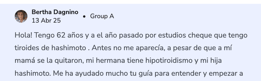 “Soy de Uruguay, tengo 63 años y mis nietas crearon esta página para ayudar a más personas con mis conocimientos que recopilé en más de 25 años de estudio, práctica y conseguir la vida que siempre desee libre de síntomas… y tú, mi niña, que estás leyendo esto ahora… espero que así sea para ti también, créeme que no es casualidad que estés leyendo esto en este preciso momento. Yo sé lo que es que se nos caiga el cabello, levantarse a media noche con sudoración, no poder hacer ejercicio por las constantes taquicardias, incluso sé lo que es sentir que no puedes ni levantarte de la cama a pesar de haber dormido…ya pasé por eso…Y por eso quiero compartirte todo lo que hice para poner en remisión mi Hipotiroidismo de Hashimoto, yo estudié nutrición pero cuando nadie daba solución a mi problema me especialicé en balance hormonal y aunque ahora este jubilada, mis nietas me animaron a compartir esta Guía que vendía hace un tiempo porque una de ellas, mi nieta Sofía también fue diagnóstica y quizo compartir todo lo que le dije que hiciera para revertir esta condición. Ahora tú puedes tenerlo en tus manos y no te costará ni la mitad de todos los años y el dinero que invertí para dar con esto”